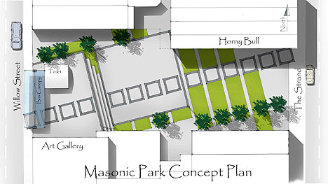 The Masonic Park site was acquired by council in 1991. It provides access from the civic centre to the waterfront, and harbour views for the street front offices in the council building.