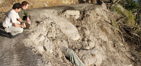 Mauao park ranger team leader Warren Aitken and council development engineering team leader Steve Hurley examine a water out pipe.