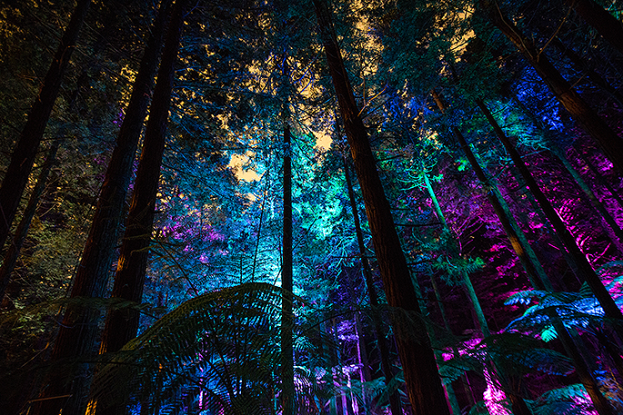 In addition to the Trubridge lighting, more than 40 infinite colour spots and feature lights will illuminate the 115-year-old redwood trees, forest ferns and pungas.