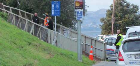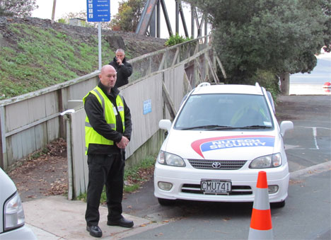 Security guards are stationed at Matapihi railway bridge guiding pedestrians.