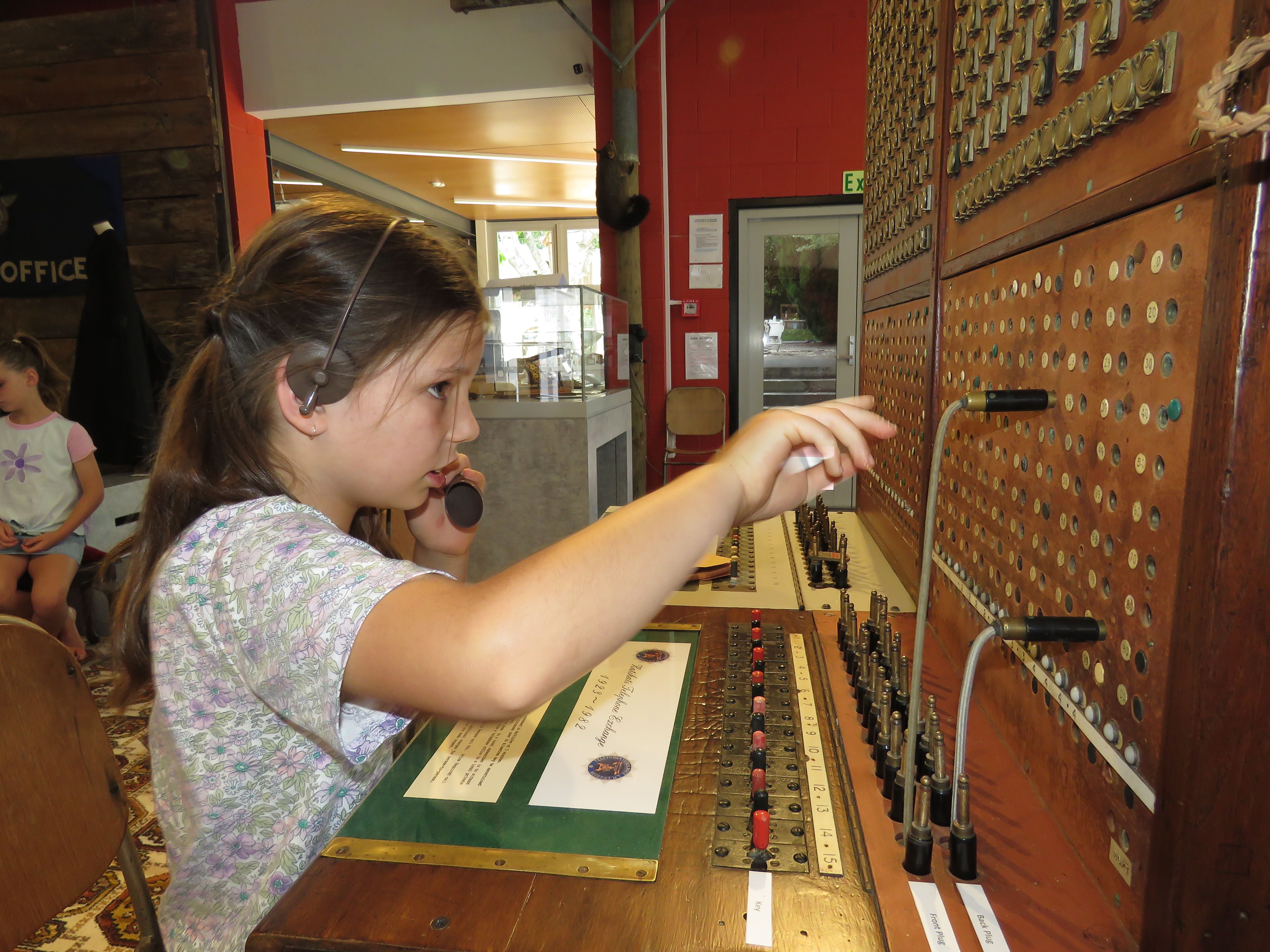 Isla Cave receives a phone call from her sister via the old Katikati Telephone Exchange. Photo: Merle Cave