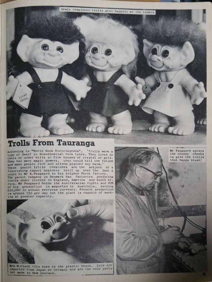 For a brief period in the 1960s and 70s, New Zealand had its own Troll manufacturing factory, based in Sulphur Point, Tauranga. It was one of only four in the world.
