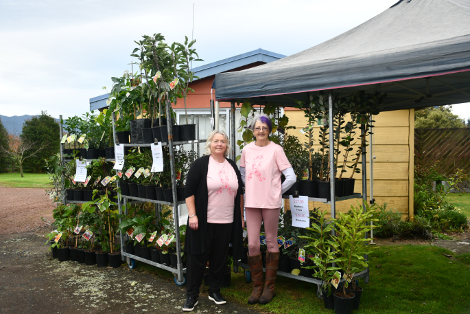 Dianne Garmonsway and Heather Catley standing in front of incredible edible plants that were for sale on the day. Photo / Supplied
