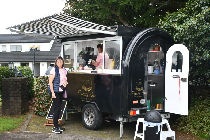 Kaye Robinson ordering a coffee to set her up for the busy morning. Photo / Supplied