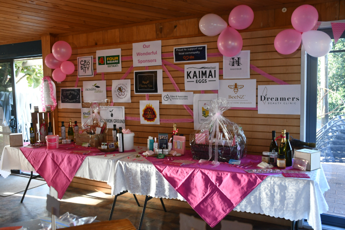 The raffle prizes with sponsors displayed on wall. Photo / Supplied