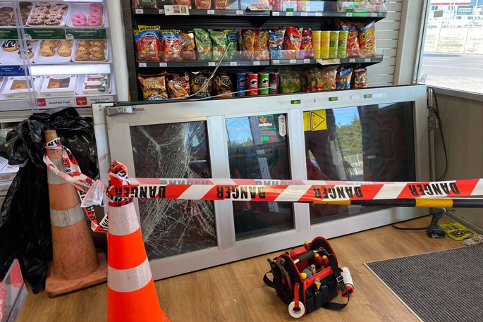 Damage at BP Connect Te Puna following a ram raid on Tuesday morning. Photo / Ayla Yeoman