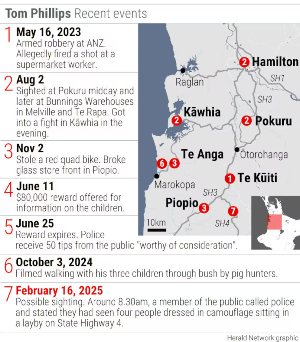 Phillips and the children were last seen in October 2024, when they were filmed by two pig hunters walking through Marokopa farmland.