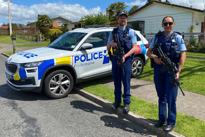 Police on duty outside the property on Manoeka Rd in Te Puke. Photo / Rosalie Liddle Crawford