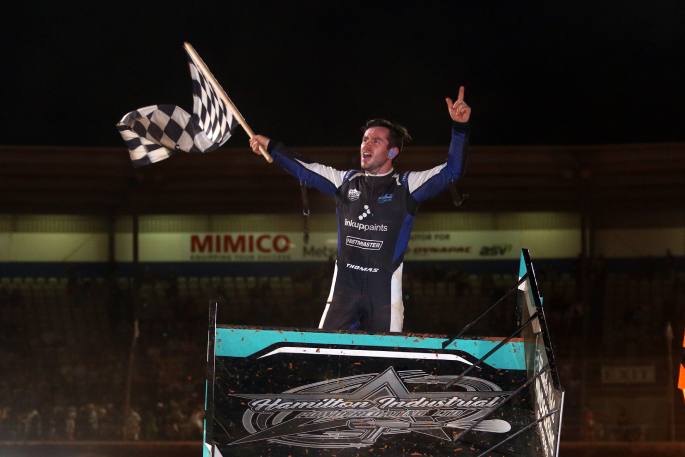 Daniel Thomas (2nz) celebrates his second feature race win of the season at Baypark Speedway. Photo / Stuart Whitaker/The Write Angle