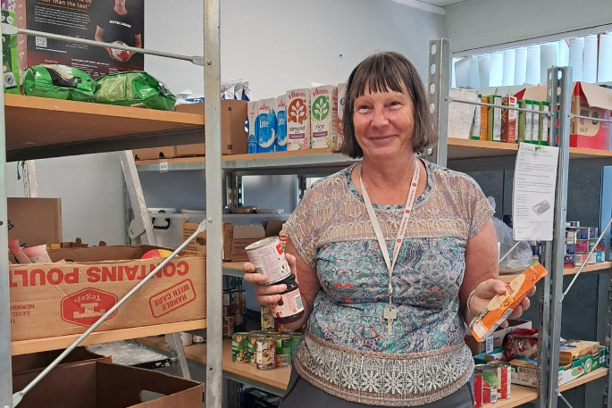 Salvation Army Community Ministries volunteer Sue Leaver, with shelves that need restocking to meet community needs. Photo / Supplied.
