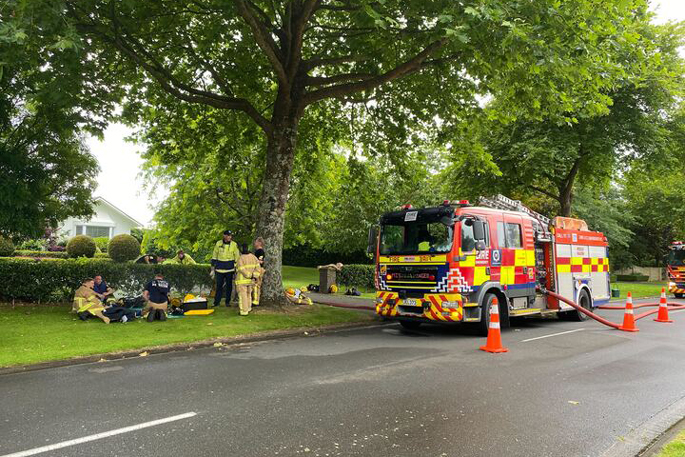 Firefighters are working to extinguish a house ire in Pyes Pa, Tauranga. Photo / Ayla Yeoman