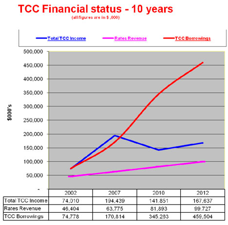 And who wouldn't be as this is really serious stuff going down here and I doubt if anyone in City Hall even remotely appreciates the severe implications. The graph tells the whole sorry story there is no escaping reality.Council's Mr Begley says full disclosure has been made but not from where I sit it hasn't and if so not in an intelligible form . Mr Stevenson may have made full disclosure TCC hasn't. Debt at 30 June 2012 is $460m and currently likely to be over $500. Lets not even start on 'derivatives' and disasters they bring with them. Financially they are the devils work and reek havoc and destruction with most balance sheets- an absolute 'no no' and TCC will rue the day they ever heard of them.