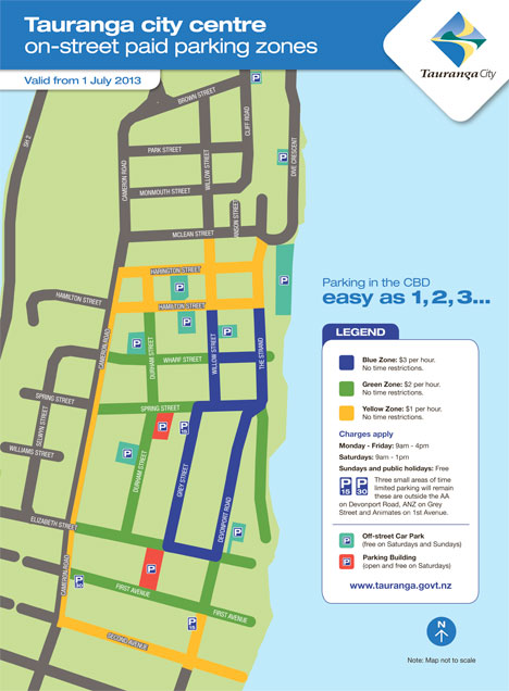 Three small areas of time restricted parking remain within the new city centre parking zones. These are the P15 parks outside Paper Plus/Kiwibank and the ANZ Bank on Grey Street; and on Devonport Road outside the AA as well as a few P30 parks on 1st Avenue outside Animates.