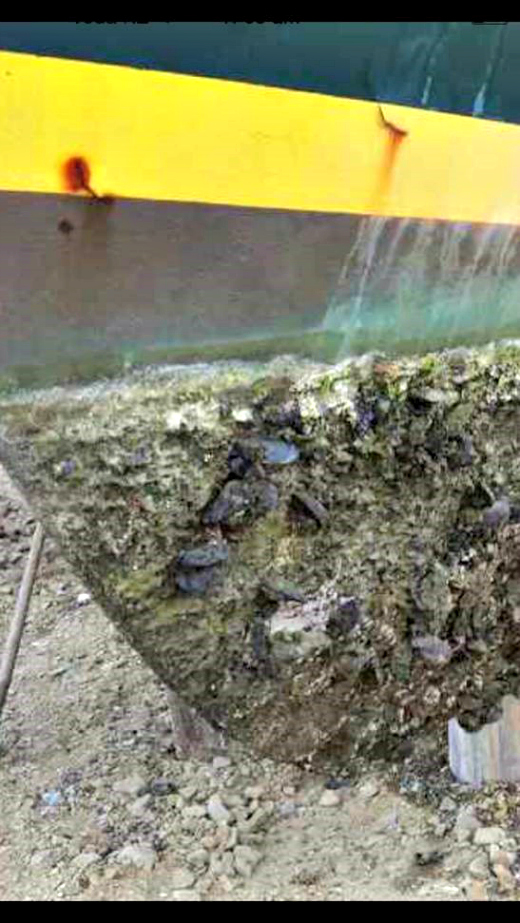 Some four tonnes of mussels were scraped off the hull after the vessel was removed from the harbour using a crane.