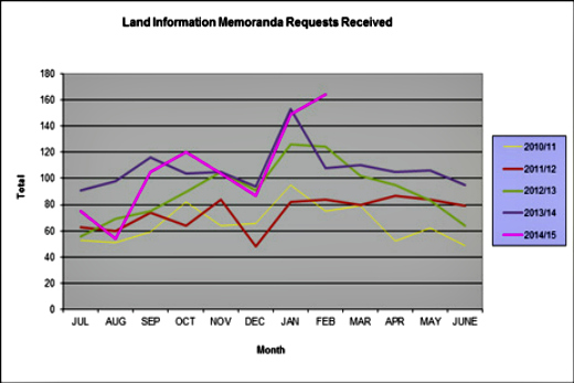 Land Information Memoranda Requests received by the Thames-Coromandel District Council from 2010/2011 to 2014/2015. Image: TCDC